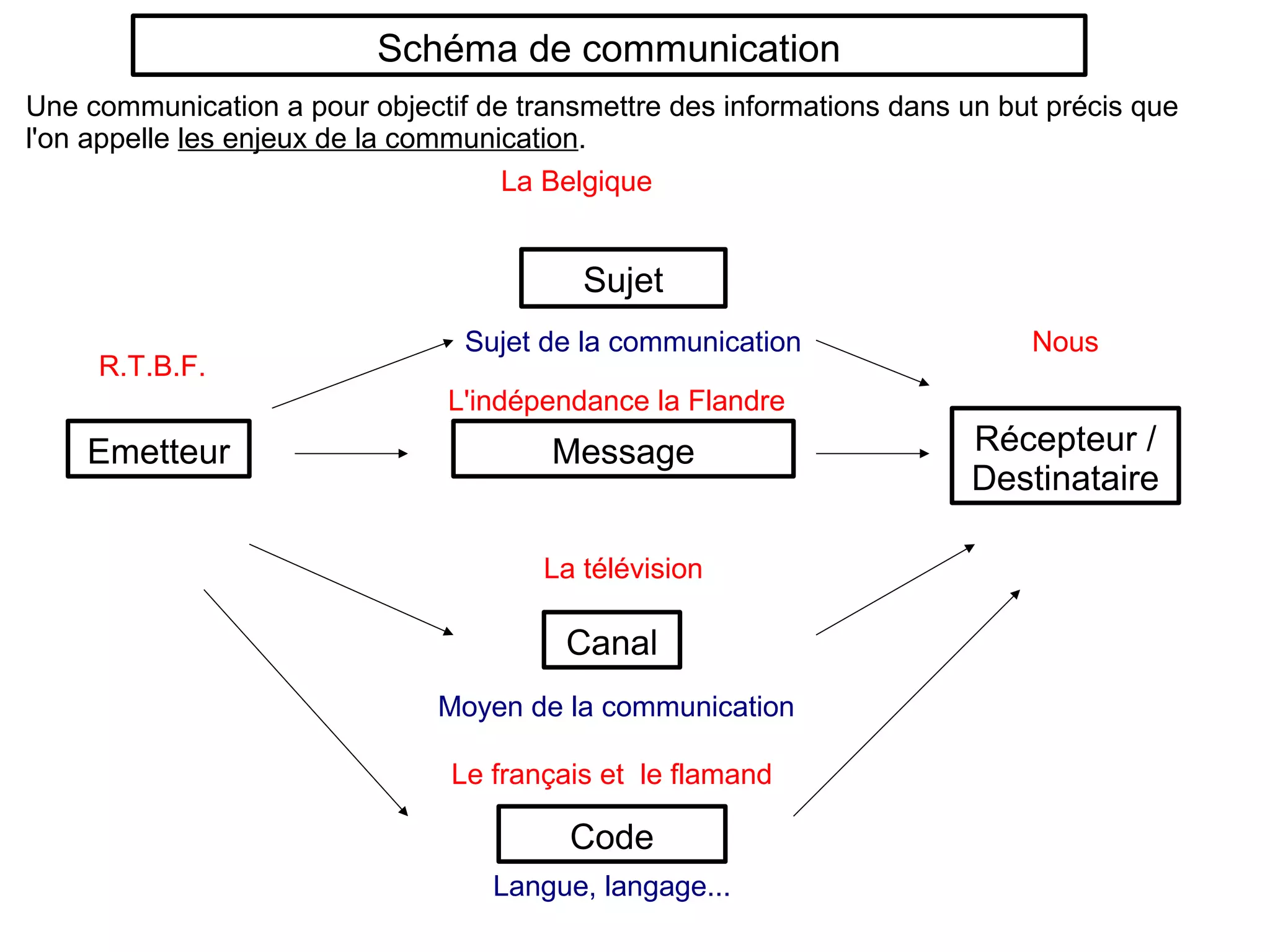 Le document traite des différents aspects de la communication, en se concentrant sur les émetteurs, récepteurs, messages et canaux. Il souligne l'importance de la langue, notamment le français et le flamand, dans le contexte belge. Il aborde également les enjeux de la communication et présente un schéma illustratif.