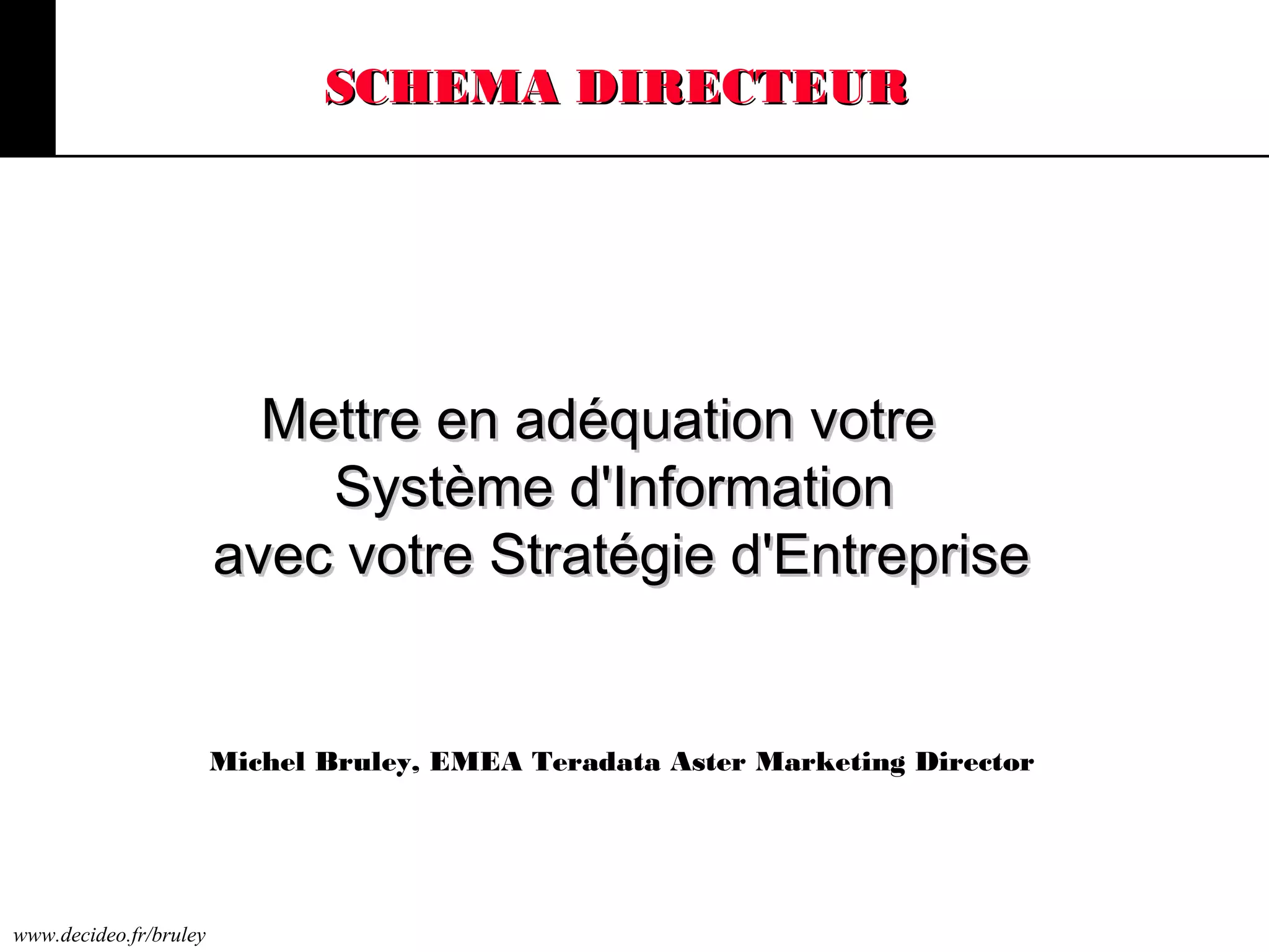 Le schéma directeur est un outil essentiel pour aligner un système d'information avec la stratégie d'entreprise, nécessitant un diagnostic des dysfonctionnements et une évaluation prospective des enjeux technologiques. Il comprend une revue de la stratégie, une analyse des forces et faiblesses, ainsi qu'un plan d'actions pour répondre aux besoins spécifiques de l'organisation. La mise en œuvre d'un schéma directeur implique une vision globale et dynamique, intégrant divers acteurs et composantes aux niveaux fonctionnels, techniques et organisationnels.