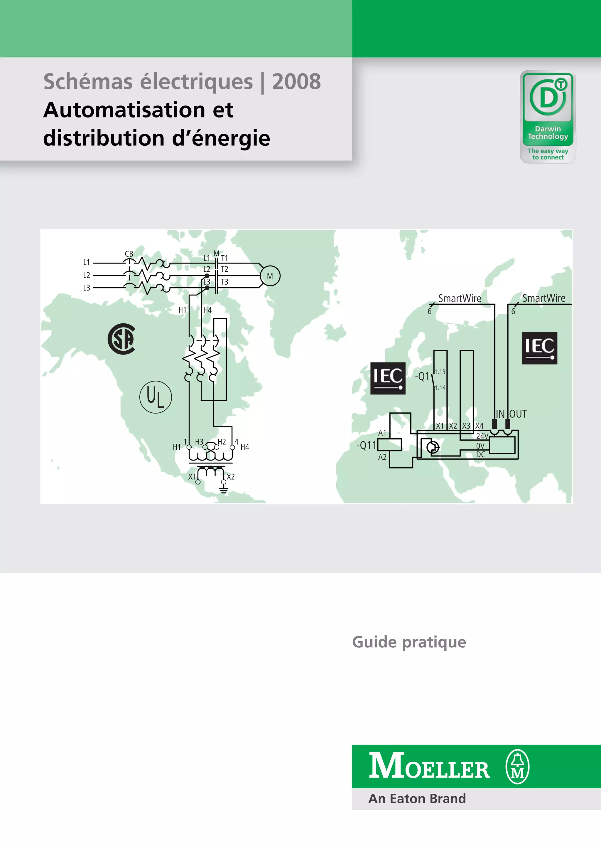 Le document présente un guide pratique sur les schémas électriques et les solutions d'automatisation et de distribution d'énergie de Moeller GmbH, une entreprise du groupe Eaton. Il inclut des informations sur l'exportation de produits vers les marchés mondiaux, des normes de sécurité et des services d'assistance technique. De plus, il met en avant des ressources éducatives en ligne, des catalogues électroniques et des options de dépannage pour les utilisateurs.
