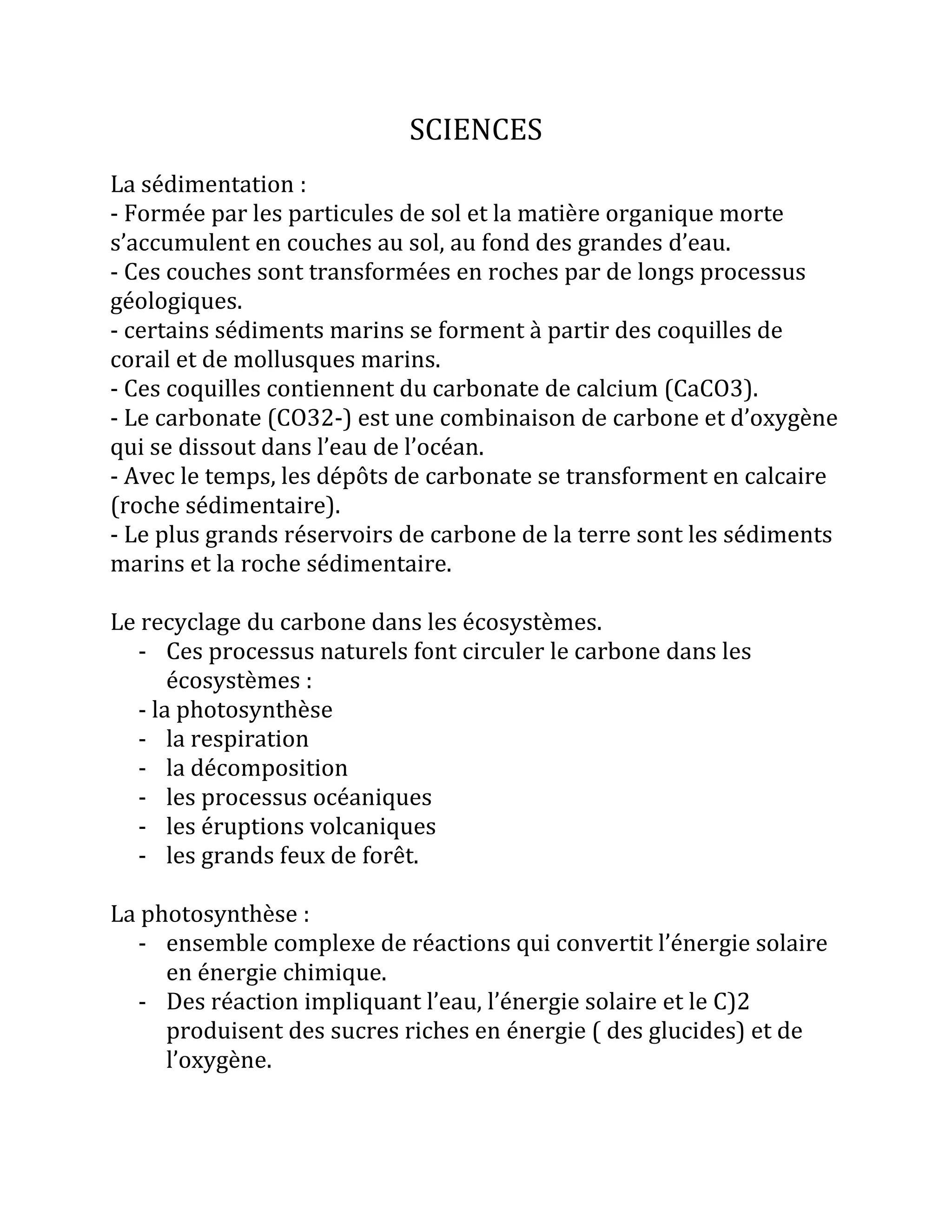 Le document traite de la sédimentation formée par l'accumulation de particules de sol et de matière organique, et de la transformation des sédiments marins en roches comme le calcaire. Il explique également le recyclage du carbone à travers divers processus naturels tels que la photosynthèse, la respiration et la décomposition. Enfin, il aborde le rôle des océans dans le cycle du carbone, notamment par la dissolution du CO2 dans les eaux froides.
