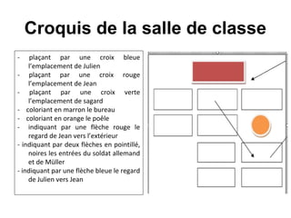 Le document présente une scène clé du film 'Au revoir les enfants' de Louis Malle, décrivant les positions des personnages Julien, Jean et Sagard dans une salle de classe. Il inclut des indications visuelles telles que des couleurs et des flèches pour illustrer les regards et les entrées, créant un croquis détaillé de la dynamique de la scène. Les photogrammes sont mentionnés pour renforcer le contexte visuel mais ne sont pas décrits individuellement.