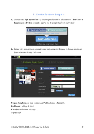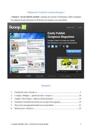 Le document est un didacticiel sur l'utilisation de l'outil de curation Scoop.it, expliquant comment créer et gérer une page personnelle pour partager des contenus pertinents. Il couvre des étapes telles que l'inscription, l'édition d'articles, la gestion des sources et la personnalisation de l'apparence de la page. Enfin, il fournit des conseils pour suivre d'autres pages sur des sujets d'intérêt.