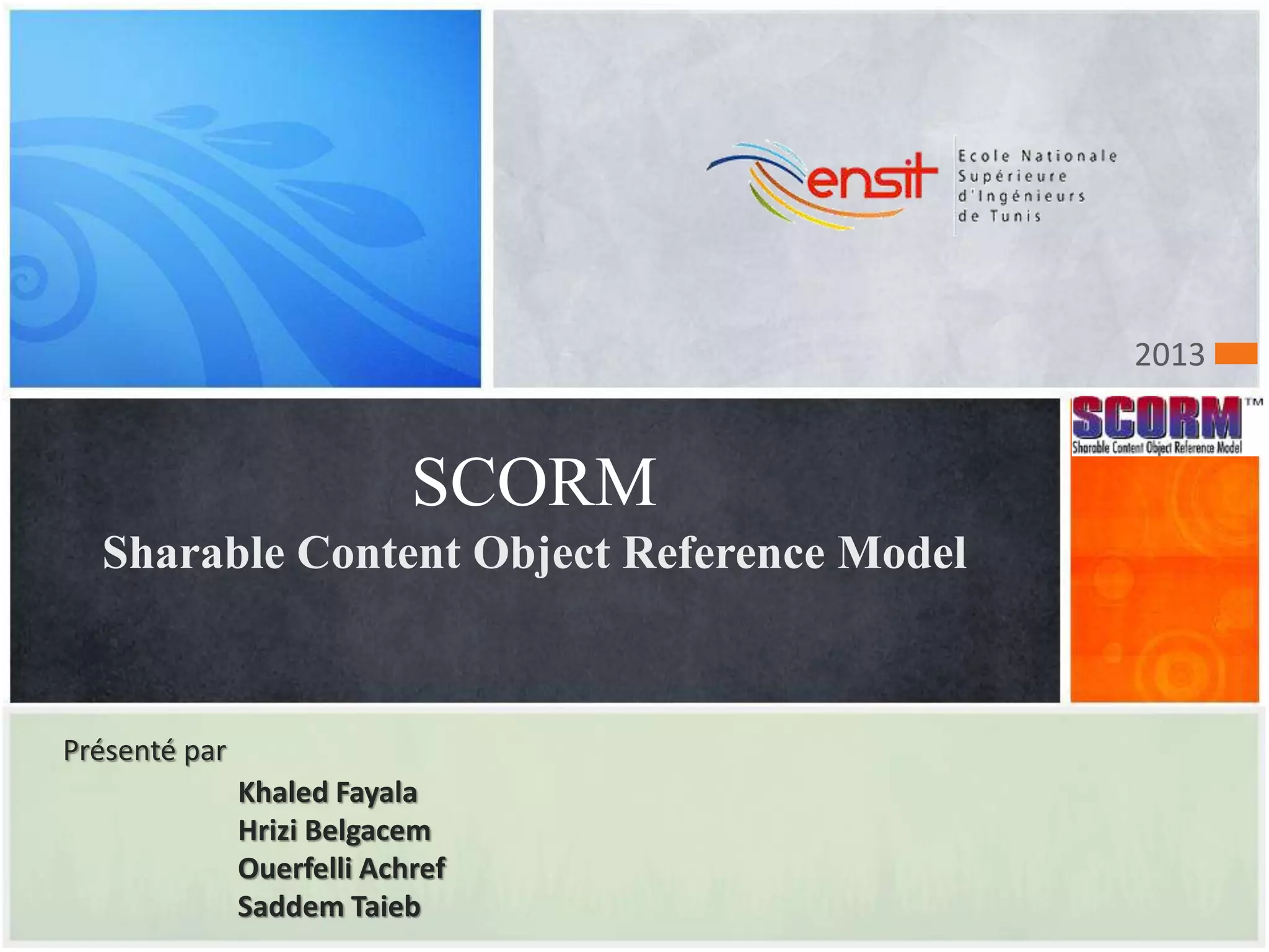 Le document présente le modèle SCORM (Sharable Content Object Reference Model) et ses objectifs principaux, qui incluent la gestion et la communication efficace des contenus pédagogiques au sein des systèmes d'apprentissage. Il aborde la structure de SCORM, les avantages de sa mise en œuvre, ainsi que les inconvénients et problèmes potentiels liés à son utilisation. En conclusion, le document souligne l'évolutivité et la standardisation de SCORM dans le paysage éducatif numérique.