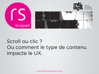 Le document examine si les utilisateurs scrollent plus qu'ils ne cliquent sur les pages web, en se basant sur des recherches de Jakob Nielsen montrant que 80% du temps des utilisateurs est passé à regarder le contenu au-dessus du pli. Bien que les utilisateurs scrollent, ils accordent seulement 20% de leur attention en dessous du pli, ce qui soulève des questions sur l'importance de la structure de navigation. La tendance vers le défilement est croissante, en particulier sur les réseaux sociaux et les appareils mobiles.