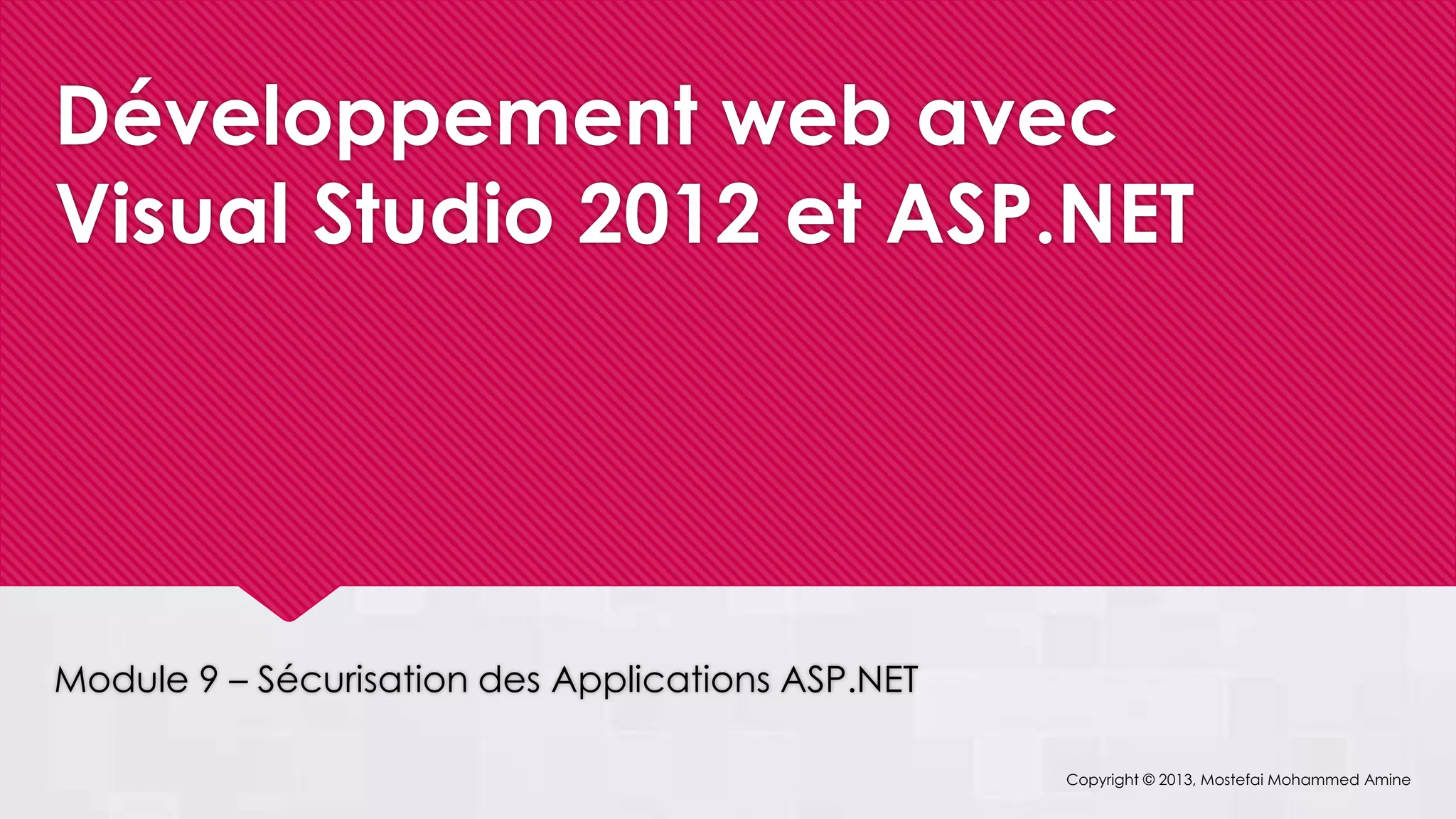 Ce module se concentre sur la sécurisation des applications ASP.NET avec Visual Studio 2012, en abordant les mécanismes d'authentification et d'autorisation pour protéger l'accès aux ressources. L'authentification vérifie l'identité des utilisateurs, tandis que l'autorisation détermine les permissions d'accès une fois l'identité confirmée. Des conseils pratiques pour la mise en œuvre des mécanismes de sécurité, tels que l'utilisation de contrôles de connexion et de fournisseurs de services, sont également fournis.