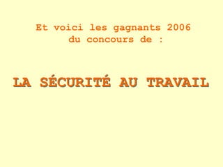 Le document présente les résultats du concours de la sécurité au travail de 2006, mettant en avant les différents gagnants par ordre de classement. Les bagagistes de l'aéroport ont obtenu la 10ème place, tandis que le service technique municipal de Côte d'Ivoire a été désigné comme le gagnant, suivi par d'autres professionnels tels que l'électricien et le mécanicien aéronautique. Un prix hors compétition a été attribué au militaire, qualifié de 'nec plus ultra'.
