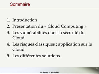 Le document explore l'état de l'art de la sécurité dans le cloud computing, en mettant en lumière les caractéristiques, vulnérabilités et risques associés à cette technologie. Il aborde également les préoccupations des utilisateurs concernant la sécurité des données, la conformité aux lois et les défis de la gouvernance. Enfin, diverses solutions pour atténuer ces risques sont proposées, soulignant la nécessité d'un cadre de sécurité robustes pour tirer parti des avantages du cloud.