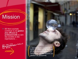 SD Worx est une société de services spécialisée dans la gestion des ressources humaines et de la paie, visant à améliorer l'efficacité organisationnelle. Avec une présence dans 25 pays européens et une expertise reconnue, elle offre des solutions personnalisées via l'externalisation, la consultation, et la formation. Fondée en 1945, SD Worx a su s'adapter et diversifier ses services au fil des décennies.