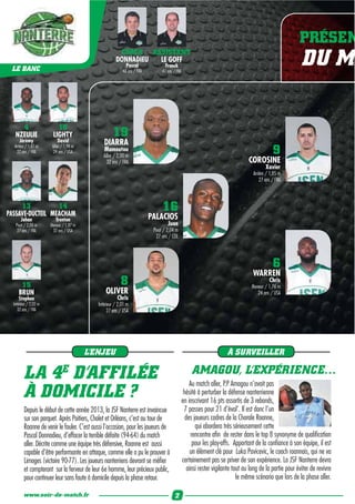 Le document présente des informations sur un match de basket de la Pro A entre la JSF Nanterre et la Chorale Roanne, mettant en avant les joueurs et leurs statistiques. Il souligne l'importance de ce match pour Nanterre afin de maintenir sa position dans le top 8 et évoque des duels clés entre joueurs. De plus, il mentionne l'expérience positive de Juan Palacios avec son intégration dans l'équipe et le soutien de ses coéquipiers et du public.