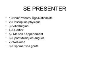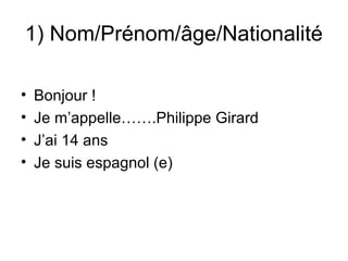 Le document décrit la structure d'une présentation personnelle incluant des informations sur le nom, l'âge, la nationalité, la description physique, la ville, le quartier, le type de logement, les activités sportives et musicales, ainsi que les préférences et loisirs. Il fournit un exemple de présentation d'un adolescent nommé Philippe Girard, habitant à Avilés, Espagne. Le texte aborde également ses goûts personnels et ses activités durant le weekend.