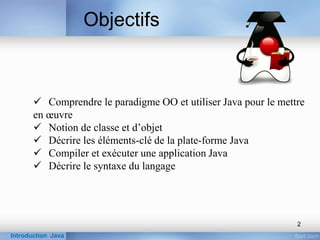 Ce document présente les concepts fondamentaux de la programmation orientée objet en Java, y compris les classes, objets, encapsulation, héritage et polymorphisme. Il décrit également l'environnement de développement Java, avec les outils nécessaires comme le JDK et le JRE, ainsi qu'un exemple de programme simple. En outre, il aborde la syntaxe de base et les structures conditionnelles et itératives en Java.