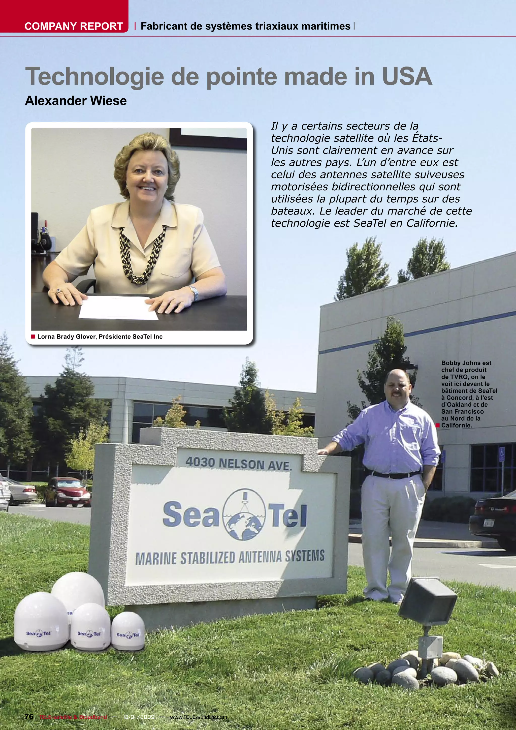 Seatel, un leader dans le domaine des antennes satellite suiveuses motorisées pour navires, détient 73% du marché américain. Sous la direction de Lorna Brady Glover, la société a ouvert de nouvelles succursales et développe constamment des produits pour répondre à la demande croissante des clients pour l'accès à la télévision et à Internet en mer. L'optimisme sur les perspectives de croissance se renforce, notamment avec l'expansion vers le marché asiatique et le développement de nouveaux systèmes multi-satellites.