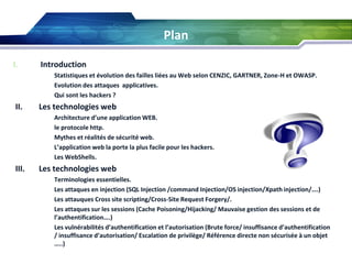 Le document aborde la sécurité des applications web en présentant les types d'attaques, les vulnérabilités courantes et l'évolution des menaces. Il met en avant l'importance de bonnes pratiques de développement et d'administration pour contrer ces attaques, ainsi que la nécessité de sensibiliser les développeurs à la sécurité. Enfin, il souligne que la majorité des applications web présentent des failles exploitables, rendant leur sécurité particulièrement préoccupante.