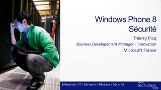 Le document discute des caractéristiques de sécurité de Windows Phone 8, incluant un modèle de sécurité amélioré par rapport à Windows Phone 7, basé sur la signature des applications, le chiffrement des données et le contrôle d'accès. Il souligne également l'importance de la protection des utilisateurs et de la confiance des développeurs à travers un écosystème harmonisé. Enfin, il présente des outils de gestion des applications et des terminaux pour les entreprises, tels que Windows Intune.