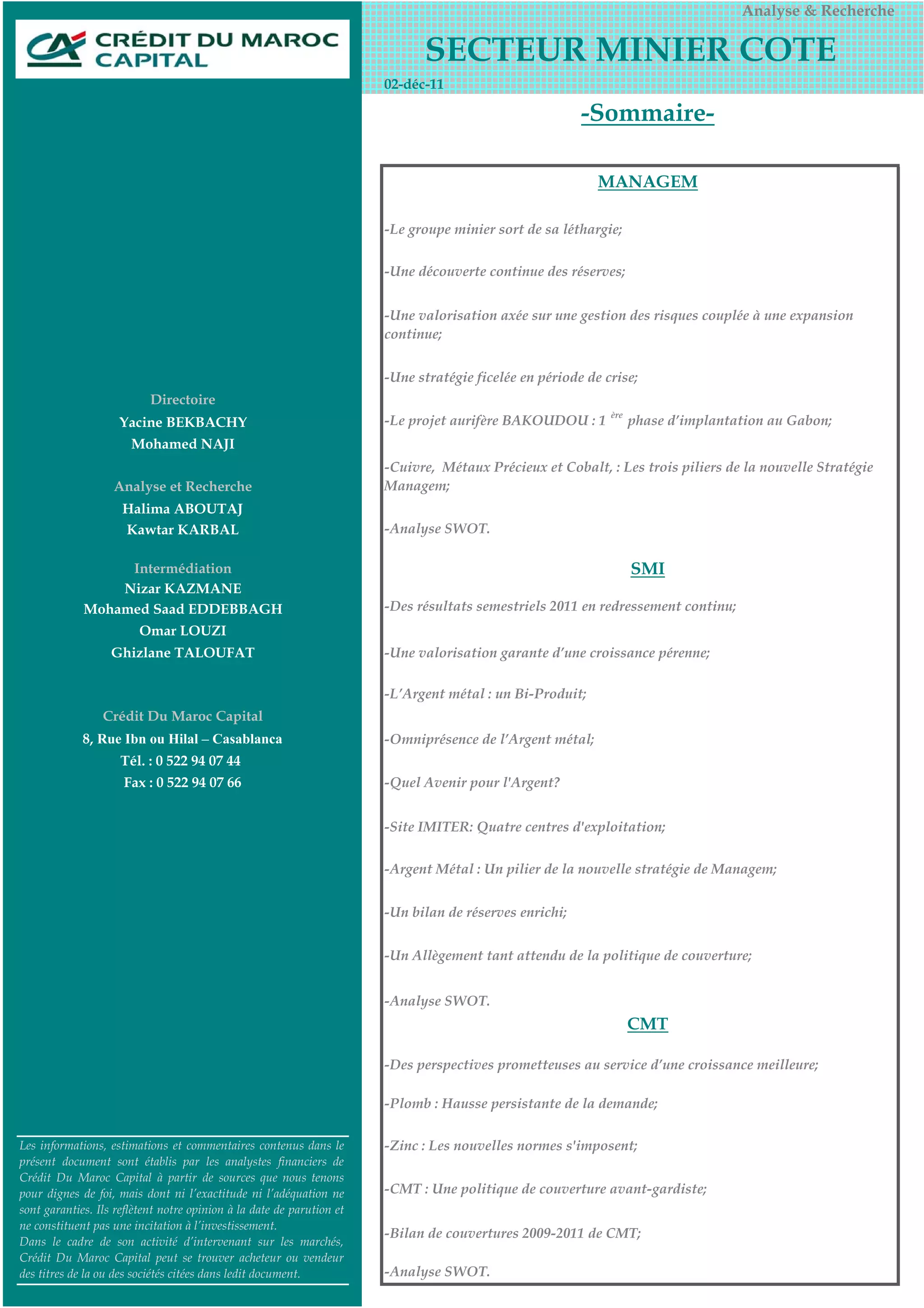 Le document analyse la performance et la stratégie du groupe minier Managem, mettant en avant une reprise significative de ses résultats financiers en 2011 grâce à l'amélioration des prix des métaux. Il souligne l'importance des projets de développement notamment dans l'or, le cuivre, et le cobalt, tout en considérant les défis du marché et les risques associés. Une valorisation basée sur les flux de trésorerie futurs suggère un prix théorique de 1 582 MAD par action, indiquant un léger potentiel de surcote par rapport au cours actuel.