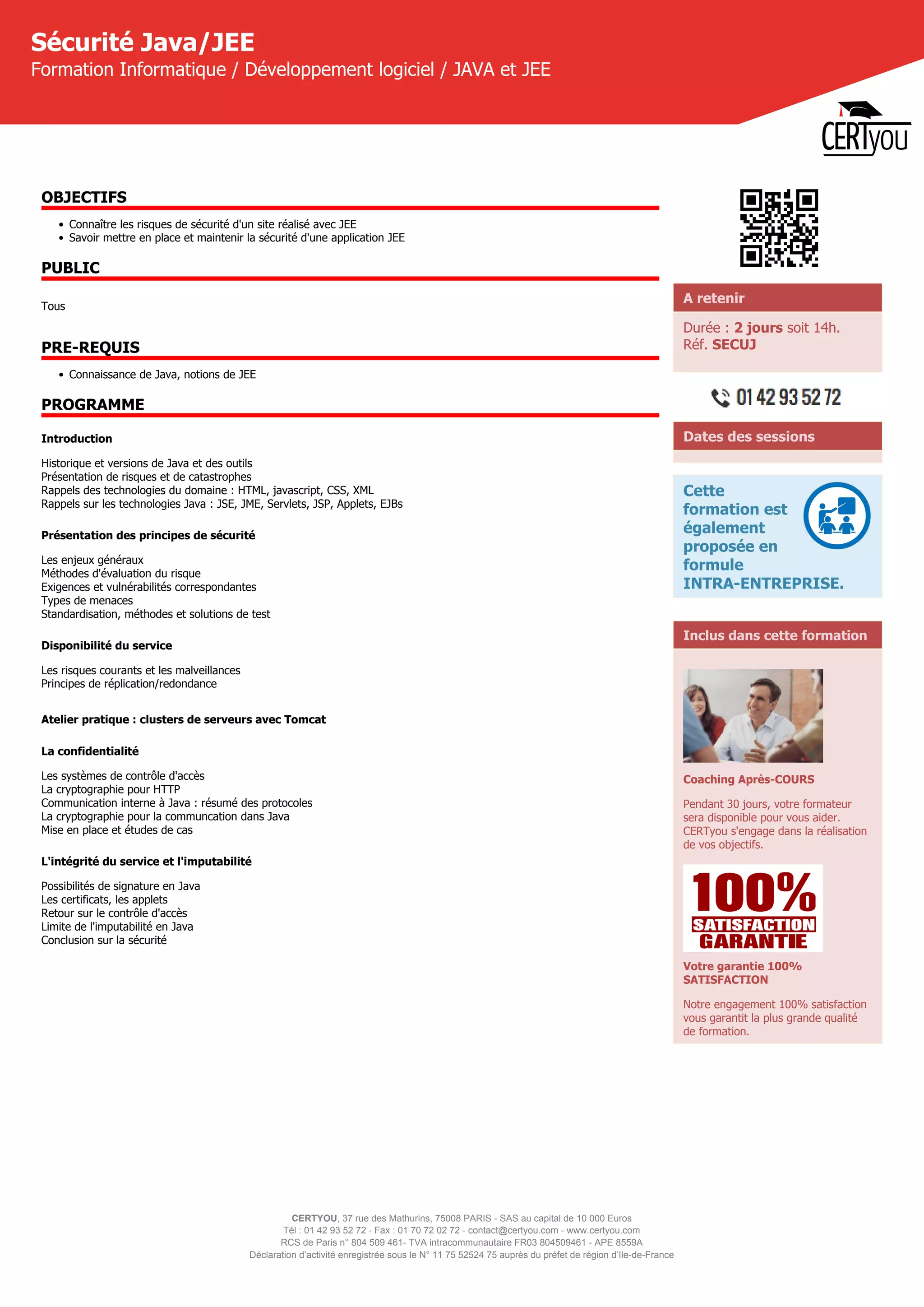 Certyou propose une formation de 2 jours sur la sécurité des applications JEE, couvrant les risques, les technologies Java et les méthodes d'évaluation des menaces. La formation inclut des ateliers pratiques et un coaching post-formation de 30 jours. Certyou garantit une satisfaction totale des participants.