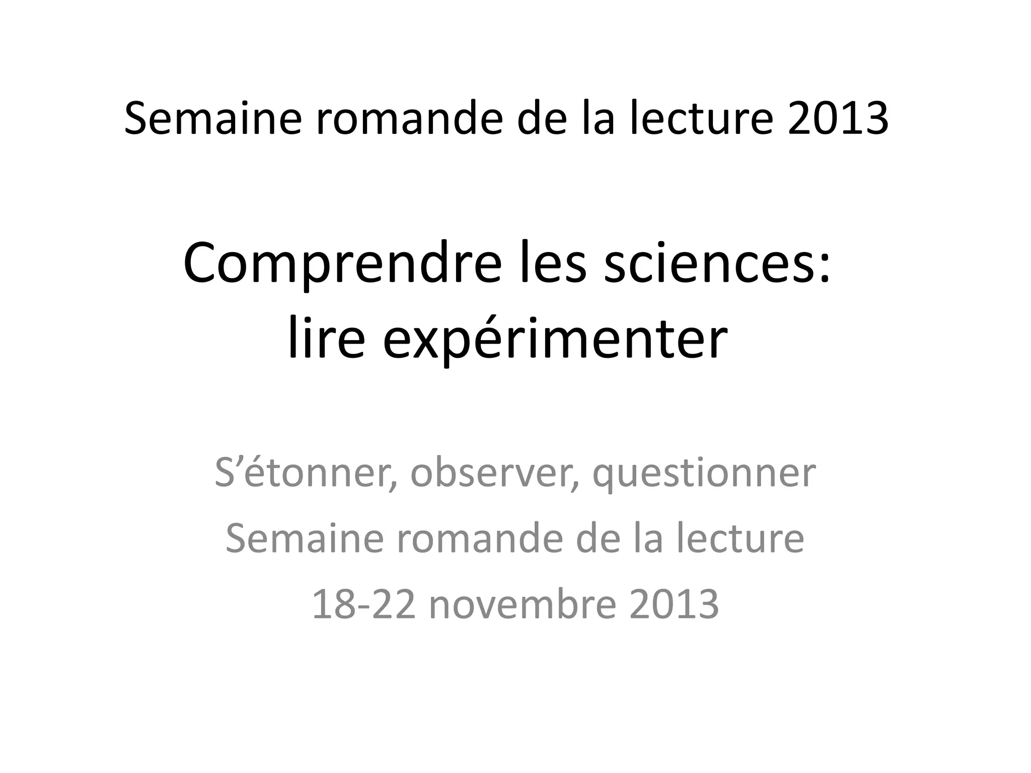 La Semaine romande de la lecture 2013 se concentre sur la compréhension des sciences à travers la lecture et l'expérimentation. L'événement vise à développer la curiosité et les compétences des élèves, en intégrant des activités interdisciplinaire sur la lecture critique et la recherche scientifique. Des ressources et des stratégies sont proposées pour aider les apprenants à mieux comprendre et analyser les documents scientifiques.
