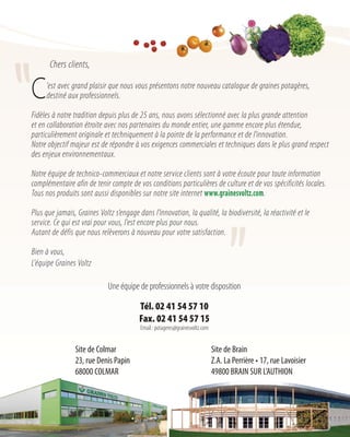 Graines Voltz, fort de ses 25 ans d'expérience, propose un large catalogue de graines potagères destiné aux professionnels, assurant une qualité et une innovation optimales. L'entreprise s'engage à respecter les enjeux environnementaux tout en offrant des variétés adaptées aux besoins spécifiques du marché. Les produits peuvent être consultés et commandés en ligne sur leur site internet, en assurant un service réactif auprès de leur équipe technique.