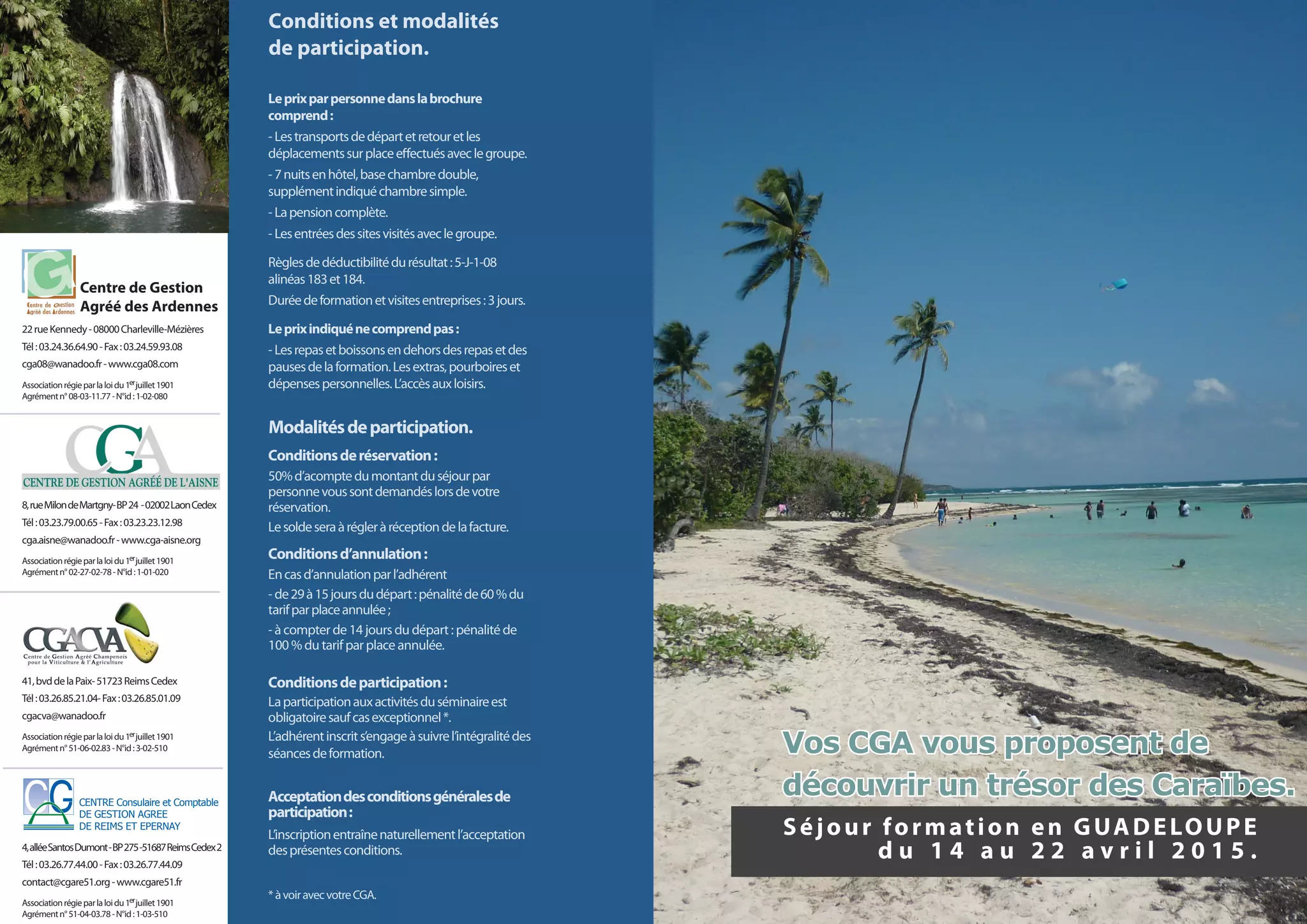 Le séjour de formation en Guadeloupe se déroulera du 14 au 22 avril 2015, incluant une semaine d'activités, de visites et de séminaires principalement axés sur le marketing et les techniques de vente. Le prix par personne en chambre double est de 1 740 € HT, incluant transports et hébergement, avec des pénalités d'annulation en fonction des délais. Les inscriptions doivent être faites avant le 30 janvier 2015, avec un acompte de 50 % requis pour valider la participation.