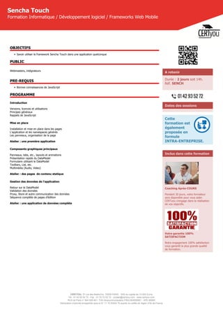 Certyou propose une formation de 2 jours sur le framework Sencha Touch, visant à enseigner son utilisation aux webmasters et intégrateurs ayant des connaissances en JavaScript. Le programme inclut des ateliers pratiques sur la création d'applications, la gestion des données et un suivi coaching après-cours. La formation est certifiée et inclut une garantie de satisfaction à 100%.