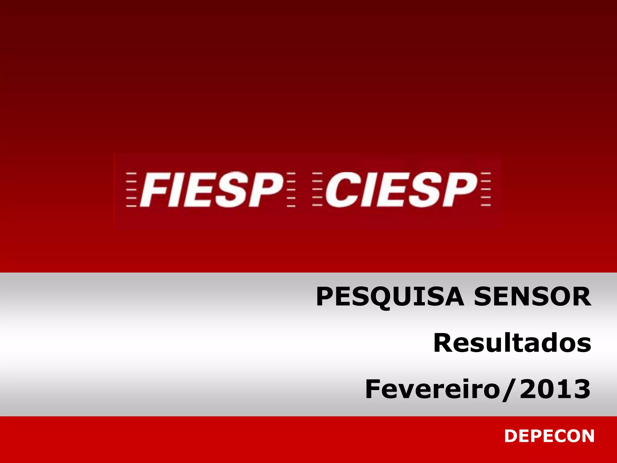 Le document présente les résultats d'une enquête sur le marché réalisée en février 2013 par Depecon pour FIESP, avec des indices indiquant une légère amélioration dans divers domaines tels que l'emploi (50,0) et les investissements (60,3). Les résultats sont comparés à une série historique mensuelle depuis novembre 2009, indiquant des fluctuations dans le sentiment économique. La tendance générale du 'sensor' suggère un retournement positif par rapport aux inquiétudes précédentes dans le marché et les ventes.