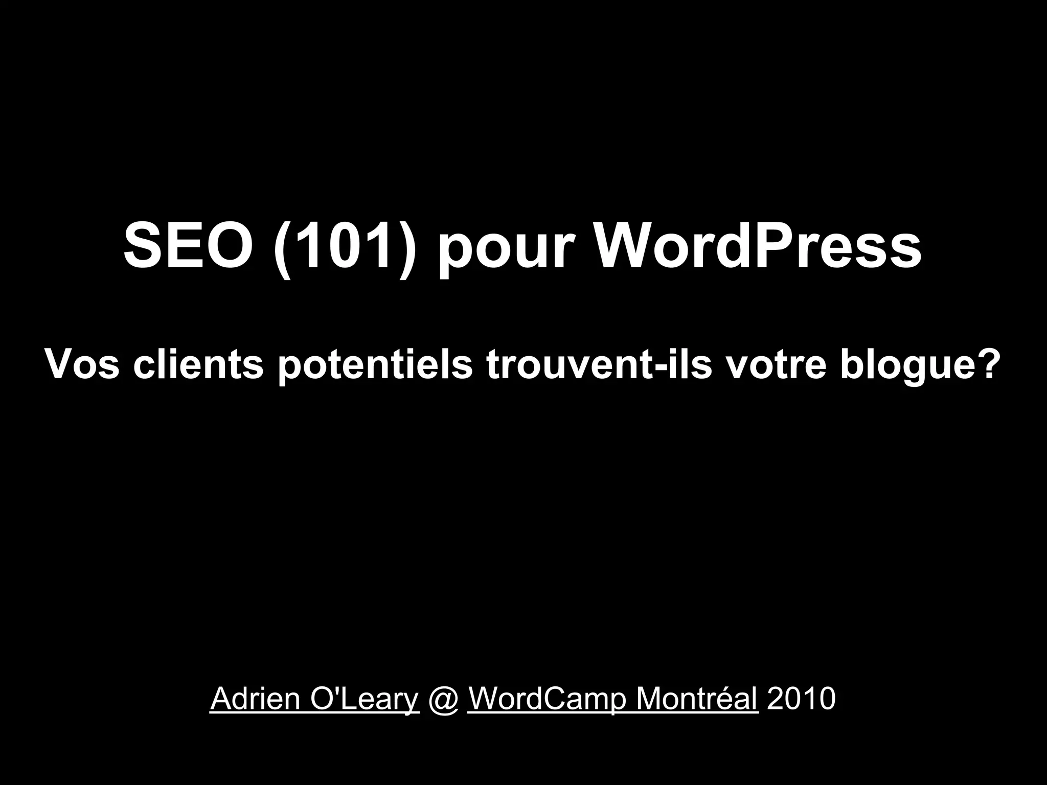 Le document présente une présentation sur le SEO pour WordPress, en se concentrant sur des conseils pratiques pour améliorer la visibilité des blogs. Il aborde des éléments essentiels comme l'optimisation des titres, des descriptions et des balises, ainsi que des aspects techniques tels que le temps de chargement. Enfin, il encourage une écoute attentive des visiteurs pour adapter le contenu en fonction de leurs recherches.