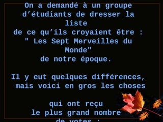 Un groupe d'étudiants a listé les sept merveilles du monde, incluant des monuments célèbres, mais une élève propose une liste de sensations humaines simples comme voir, entendre et aimer. Ce contraste souligne que les véritables merveilles de la vie sont souvent négligées. Le message final encourage à apprécier les petites choses et à partager cet amour avec ceux qui comptent.