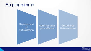 Le document présente les nouveautés de l'Active Directory dans Windows Server 2012, mettant l'accent sur le déploiement simplifié, la compatibilité avec la virtualisation et une gestion améliorée de l'infrastructure. Des fonctionnalités telles que le clonage des contrôleurs de domaine et des configurations de sécurité renforcées sont également mises en avant, permettant une administration plus efficace des comptes et des politiques. En résumé, Windows Server 2012 offre une expérience plus rapide et uniforme pour le déploiement et la gestion d'Active Directory.