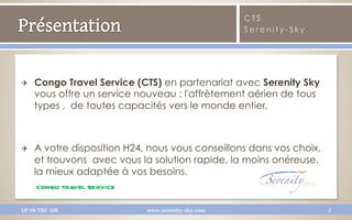 CTS Serenity-Sky propose un service d'affrètement aérien international adapté à divers besoins professionnels et événementiels, avec un engagement envers l'efficacité et la sérénité. L'entreprise offre des solutions personnalisées, y compris des vols spéciaux, des services de cargo, ainsi que des options de luxe et de catering sur mesure. Joignable 24h/24, Serenity-Sky se positionne comme un partenaire de confiance pour la planification et l'exécution de missions aériennes.