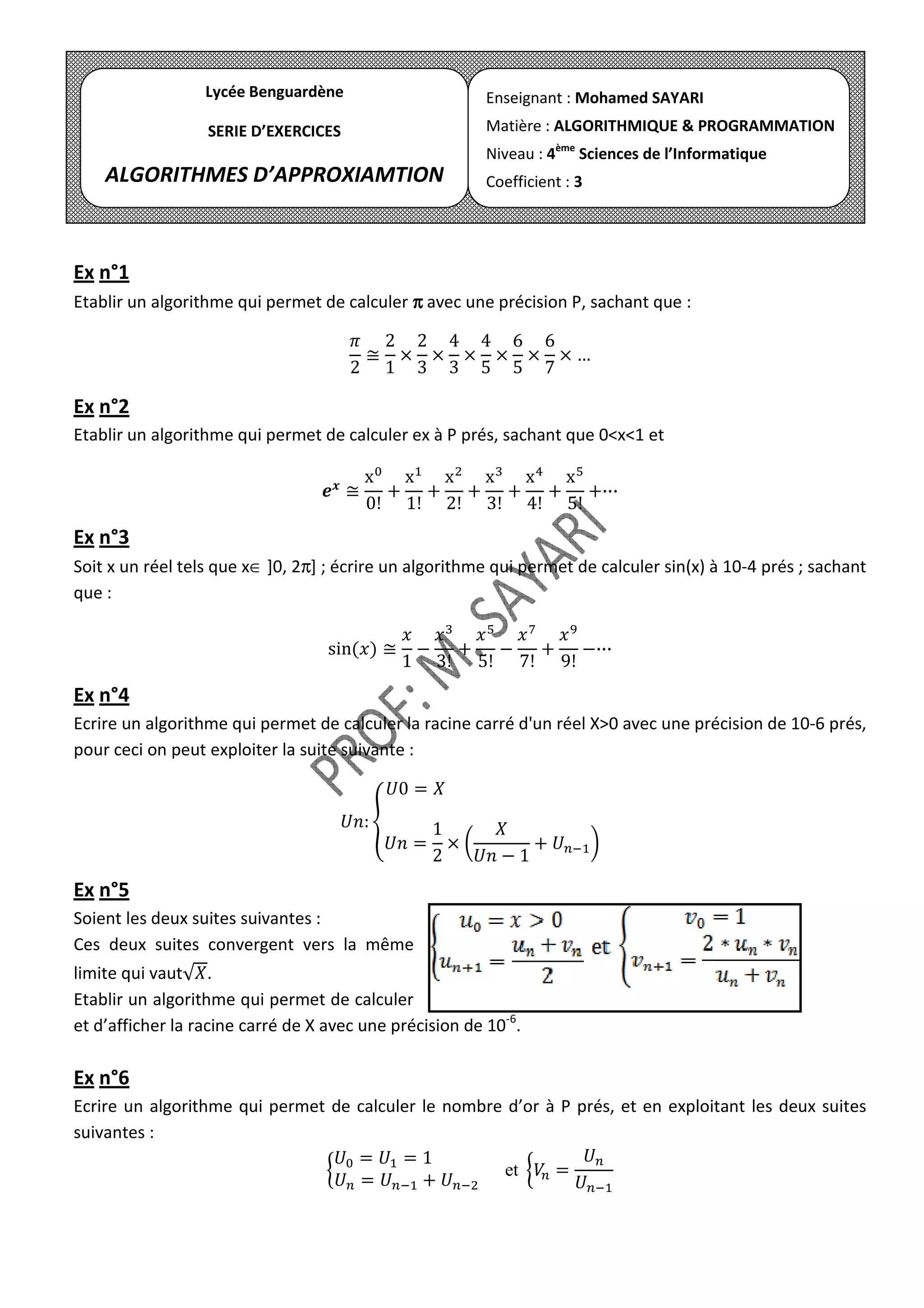 Le document présente une série d'exercices en algorithmique et programmation pour des élèves de 4ème en sciences de l'informatique. Chaque exercice consiste à établir des algorithmes pour calculer des valeurs mathématiques précises telles que π, e, sin(x), la racine carrée, et le nombre d'or. La précision requise pour ces calculs varie entre 10^-4 et 10^-6.