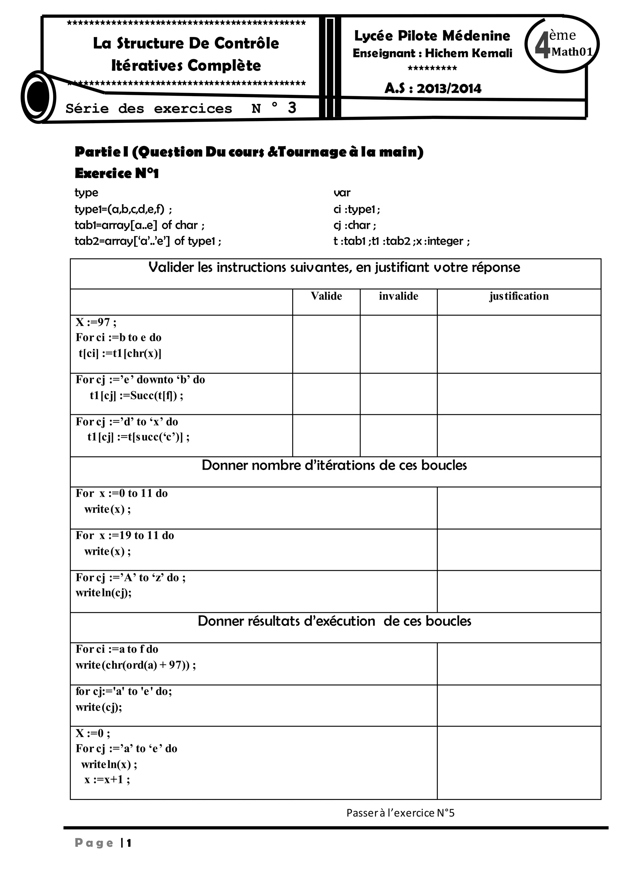 Le document présente une série d'exercices de programmation en Pascal, abordant des structures de contrôle itératives et conditionnelles. Il inclut des questions sur l'affichage de couples de nombres, la détection des entiers parfaits, et des fragments de programme. Des algorithmes pour inverser des chaînes et manipuler des tableaux sont également discutés.