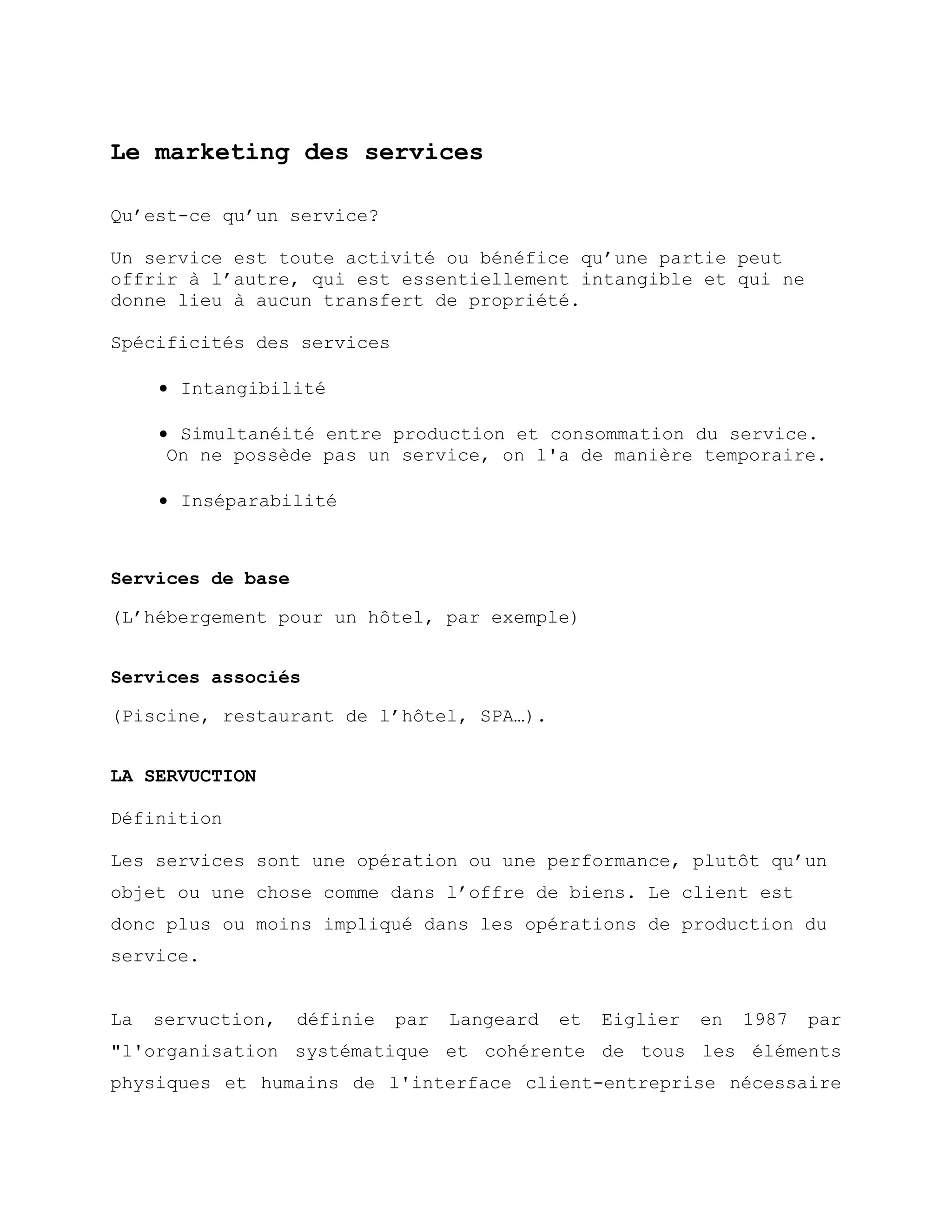 Le document traite du marketing des services, en définissant un service comme une activité intangible sans transfert de propriété et en explorant ses spécificités telles que l'intangibilité, la simultanéité de production et consommation, et l'inséparabilité. Il met également en lumière l'importance de la servuction, qui inclut l'organisation des éléments humains et physiques, et comment les écarts entre les attentes et la réalité du service peuvent affecter la qualité perçue par le client. Enfin, il évoque les stratégies de communication et de qualité qui aident à améliorer l'expérience client et à différencier les services offerts.