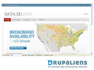 Le document traite de la récupération et de la réutilisation de 1200 indicateurs pour 200 pays en utilisant Drupal et OpenData. Il met en avant des problèmes liés à la taille et à la répétition des données et propose des perspectives d'avenir reposant sur des solutions open source et des données liées. L'objectif est d'encourager chaque collectivité à créer et réutiliser des catalogues standards de données exposées en RDF, interrogeables via SPARQL.
