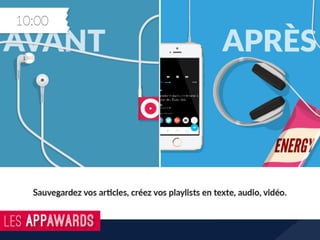 Les App Awards est un concours d'applications qui célèbre l'innovation dans le secteur mobile, ayant accueilli plus de 900 participations depuis 2010. En 2016, un jury composé de professionnels récompense les meilleures applications selon divers critères, tout en favorisant l'échange et le partage de connaissances. L'événement attire des témoignages positifs soulignant son impact sur les startups et l'écosystème des applications mobiles.