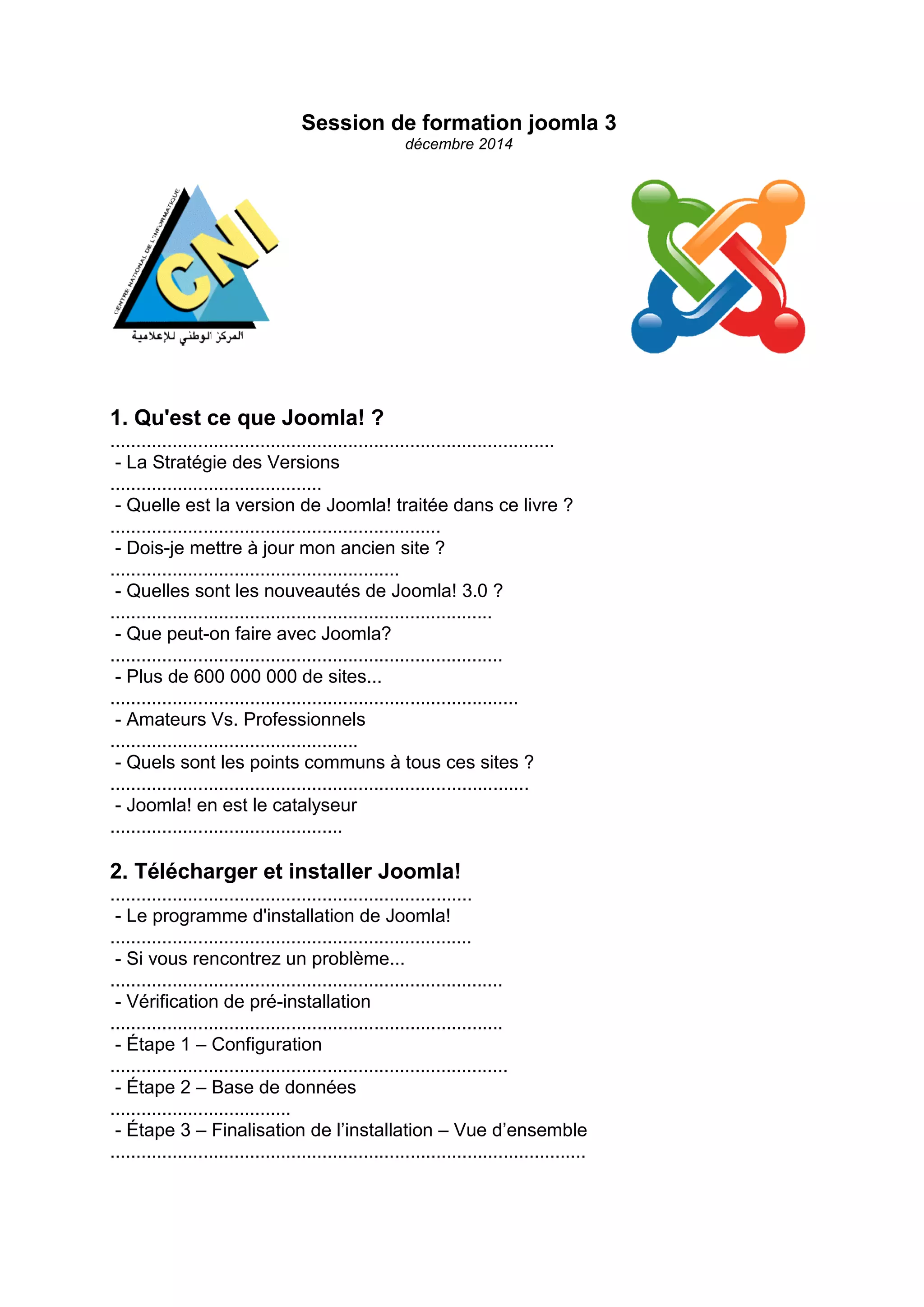 Le document est un guide de formation sur Joomla!, abordant des sujets tels que l'installation, la conception, la gestion des utilisateurs et la création de contenu. Il couvre également des aspects avancés comme les extensions, les médias sociaux et les tâches courantes liées à la maintenance du site. La session de formation vise à fournir une compréhension approfondie de Joomla! et de ses fonctionnalités pour les utilisateurs de tous niveaux.
