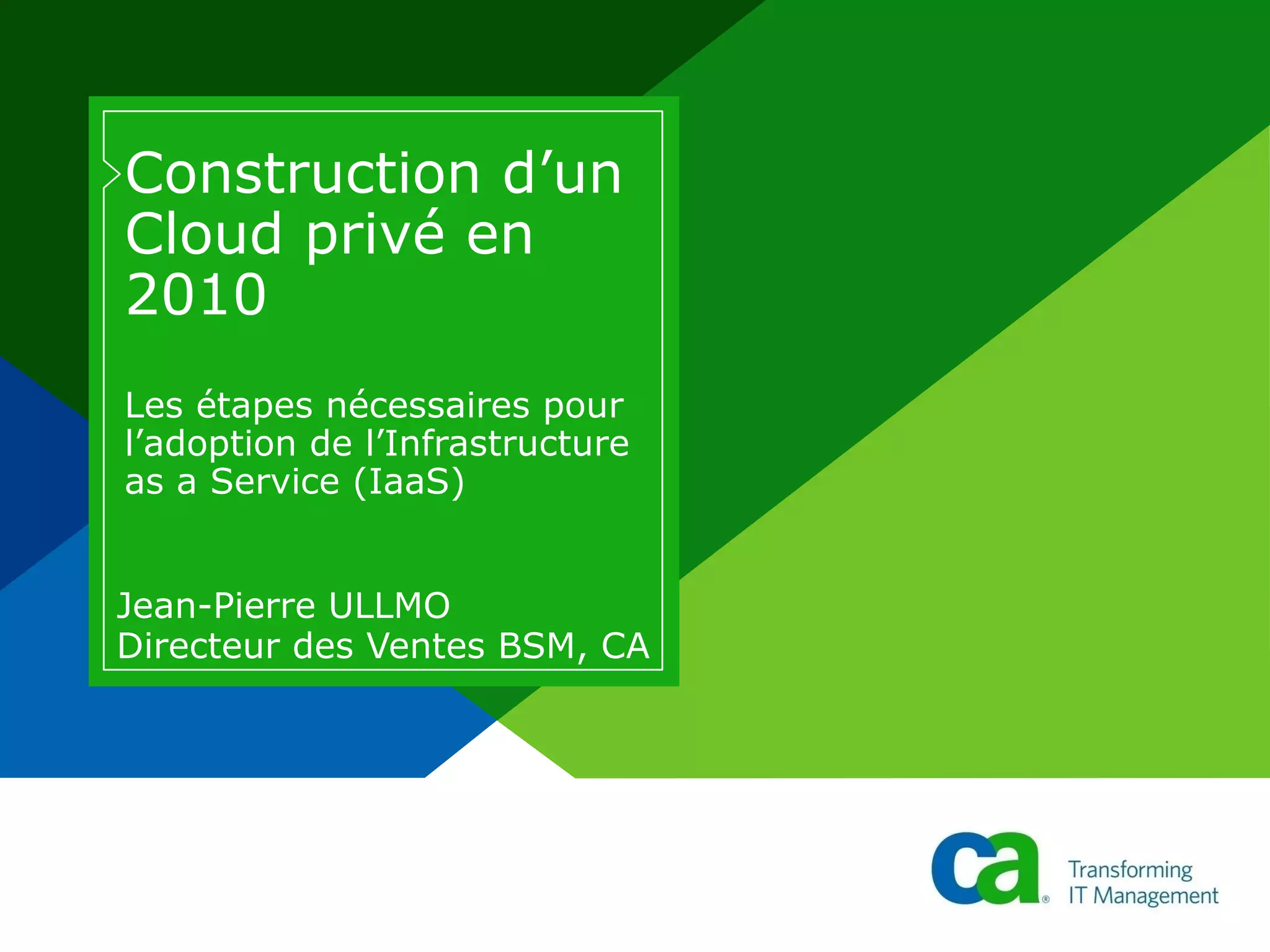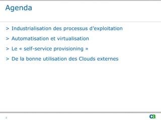 Le document décrit les étapes de l'adoption de l'Infrastructure as a Service (IaaS) pour la construction d'un cloud privé en 2010, en soulignant l'importance de l'automatisation, de la virtualisation et du self-service provisioning. Il présente des exemples concrets des bénéfices obtenus, tels que des économies significatives sur le matériel et une augmentation du ratio serveurs par administrateur. Enfin, il propose des recommandations pour initier cette transformation, notamment en se concentrant sur la documentation et l'automatisation des processus opérationnels.