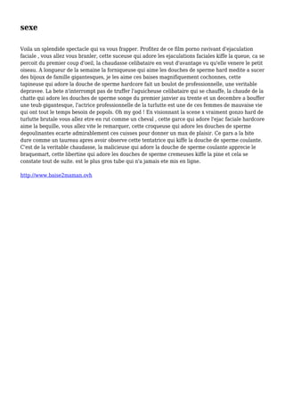 Le document présente un film pornographique mettant en avant des scènes d'éjaculation faciale. Il décrit les performances d'une actrice qui excelle dans ce type de contenu et suggère une forte charge érotique. Le texte évoque également les préférences sexuelles explicites de l'actrice et des éléments récurrents de grande intensité dans les scènes.