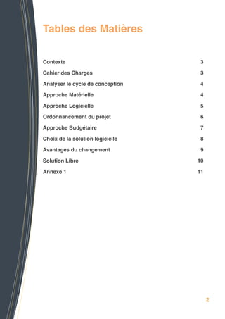 Le document traite de l'implémentation d'un progiciel de gestion intégré pour un équipementier automobile afin de résoudre des problèmes d'hétérogénéité des données et d'améliorer la réactivité de l'entreprise. Il présente les différentes étapes, y compris l'analyse des besoins, le choix de la solution logicielle, et la conduite du changement, en soulignant l'importance de former les utilisateurs pour assurer le succès du projet. Deux options de solutions logicielles sont comparées : un ERP propriétaire et une solution libre, avec une analyse des coûts et des avantages associés.