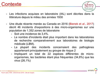 Le document aborde la prévention des risques infectieux dans les laboratoires de santé animale, soulignant l'importance de la sécurité biologique et de la sûreté biologique pour protéger le personnel et l'environnement. Il présente divers niveaux de sécurité biologique, les mesures de confinement, ainsi que la nécessité de former le personnel pour limiter les risques d'exposition aux agents pathogènes. Enfin, il insiste sur l'importance d'une évaluation continue des risques et des pratiques pour garantir un environnement de travail sécurisé.