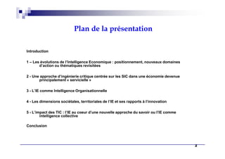 L'intelligence économique est devenue cruciale pour aider les organisations à naviguer dans un environnement concurrentiel, évoluant d'une économie industrielle à une économie servicielle et immatérielle. Le document explore son positionnement, ses nouveaux domaines d'action, ainsi que ses dimensions sociétales et territoriales, tout en envisageant l'intelligence économique comme une forme d'intelligence organisationnelle. Il met également en lumière l'impact des nouvelles technologies de l'information et de la communication sur l'intellect collectif et la gestion des complexités organisationnelles.