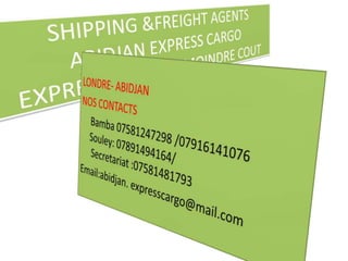 Abidjan Express Cargo propose des services d'expédition de fret à bas prix de Londres à Abidjan, incluant l'envoi d'effets personnels et de véhicules à partir de £390. Les contacts pour plus d'informations incluent Bamba, Souley, et le secrétariat via téléphone ou email. Des détails supplémentaires seront disponibles sur www.ivoireplanete.com.