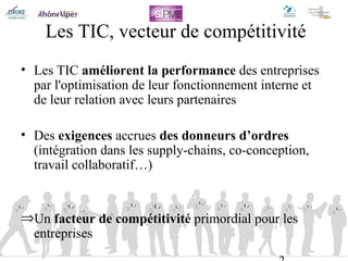 Le programme Si PME vise à améliorer la compétitivité des petites et moyennes entreprises (PME) à travers l'intégration des technologies de l'information et de la communication (TIC). Il propose des accompagnements personnalisés pour formaliser la stratégie TIC des PME, avec un ensemble d'outils et de formations sur une période déterminée. Les coûts de ces services sont réduits grâce à la participation financière des instances régionales et un suivi des résultats est mis en place afin d'assurer la pérennisation des projets.