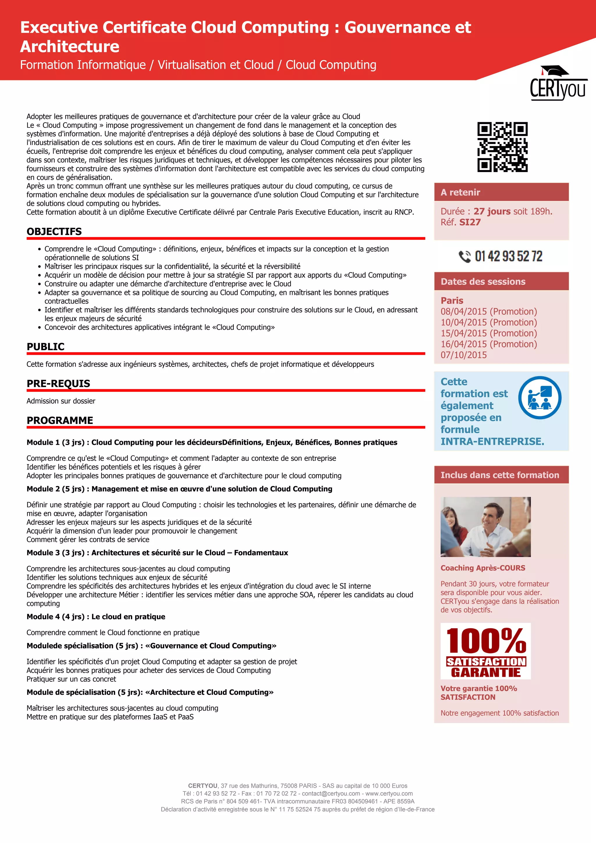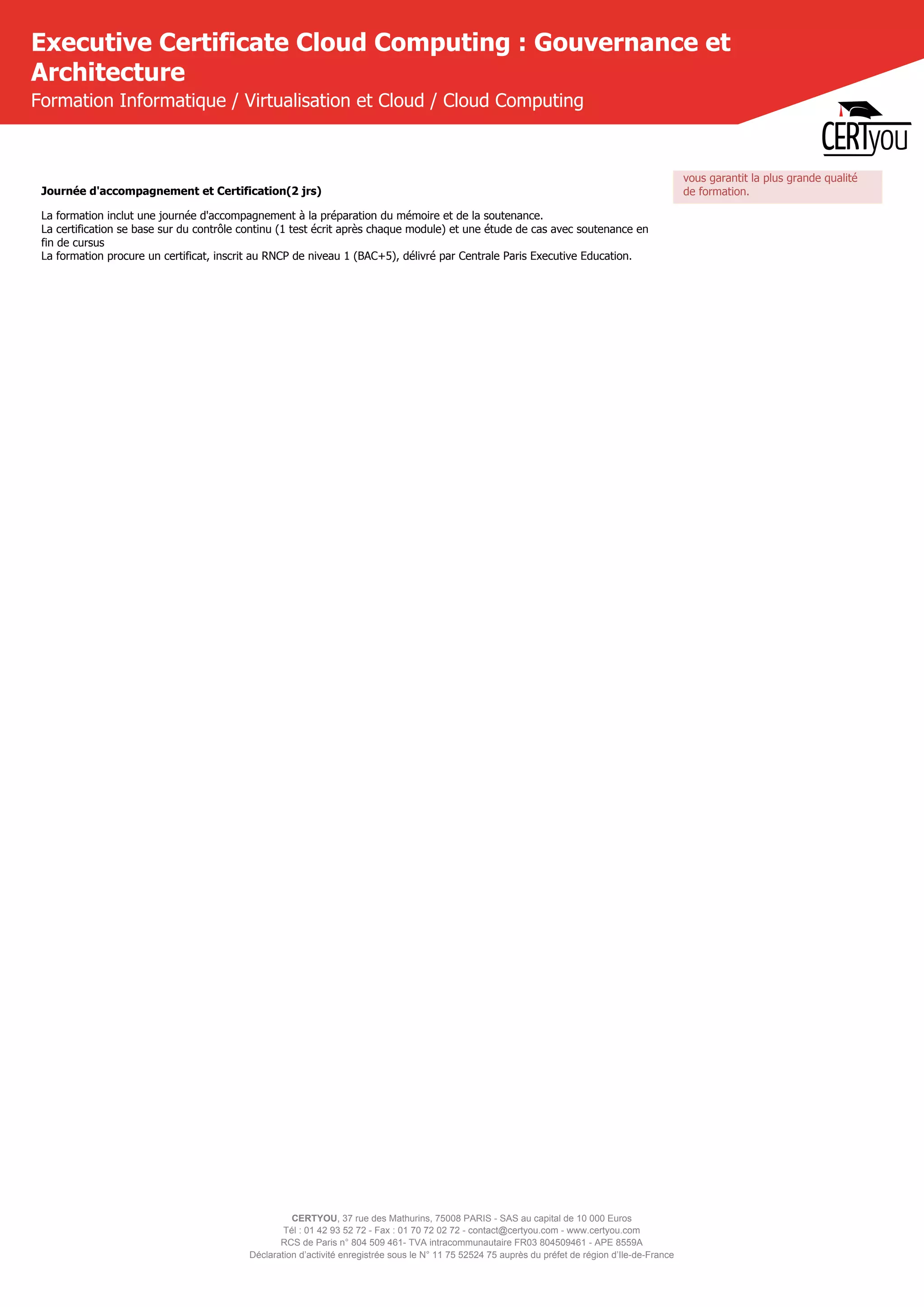 Le document présente un programme de certification exécutif en cloud computing, axé sur la gouvernance et l'architecture. Il décrit la formation, qui comprend des modules sur la compréhension du cloud, la gestion de projets cloud, et la sécurité des architectures cloud. Ce cursus de 27 jours, destiné à des professionnels de l'informatique, se conclut par une certification délivrée par Centrale Paris Executive Education.
