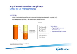 La présentation aborde l'acquisition et le partage de données énergétiques dans des installations non résidentielles, visant à optimiser la gestion des consommations énergétiques et à répondre aux obligations réglementaires. Elle détaille les typologies de systèmes d'acquisition de données, souligne l'importance de la conformité, et présente des outils existants pour la mesure et le contrôle utilisés dans le cadre de certifications telles que ISO 50001. Enfin, des exemples pratiques illustrent l'application d'un système de gestion de l'énergie dans des bâtiments tertiaires.