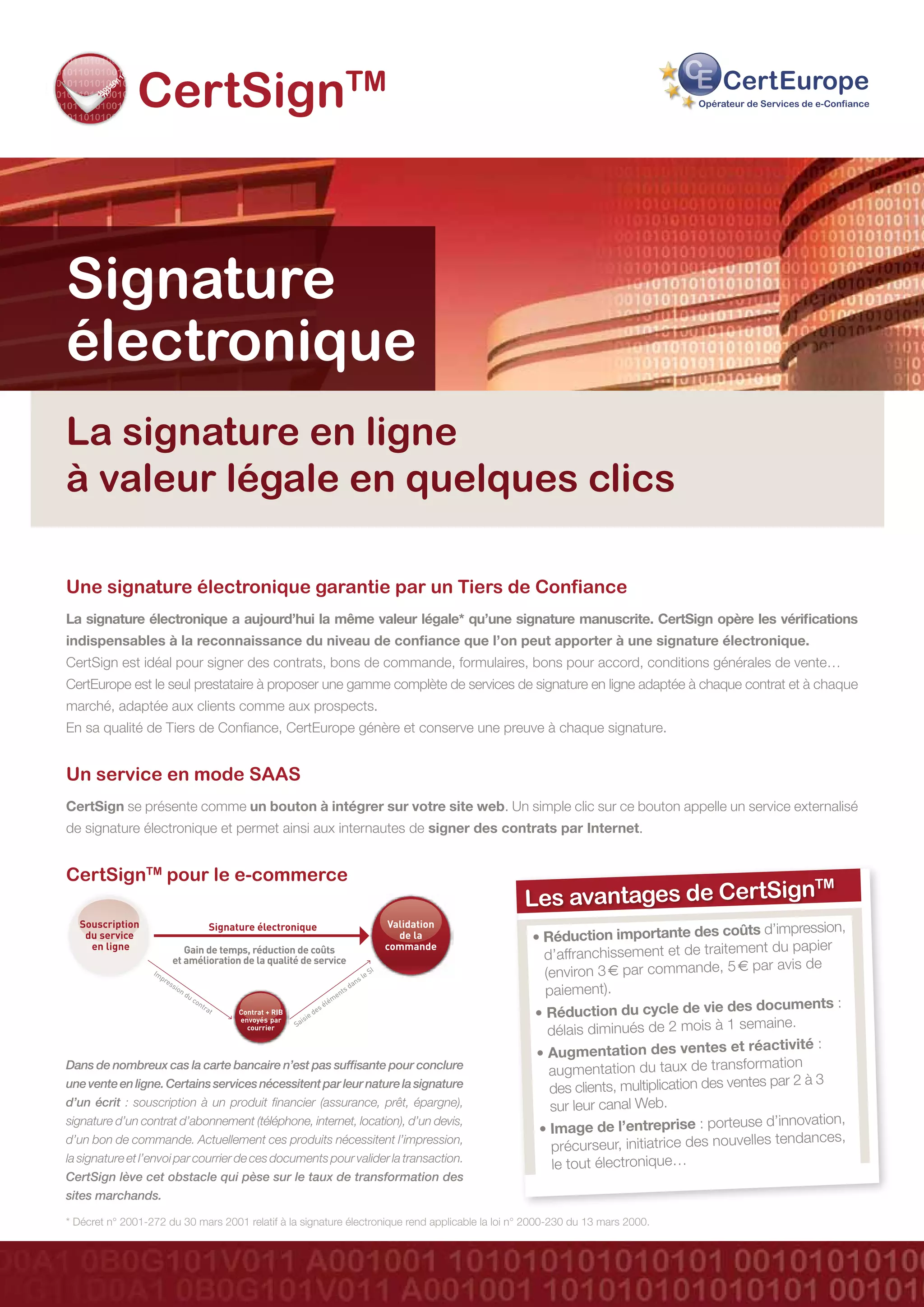 Certeurope propose des services de signature électronique légaux, permettant aux utilisateurs de signer des documents en ligne avec une valeur équivalente à la signature manuscrite. Grâce à son service certsign, les entreprises peuvent réduire les coûts et améliorer l'efficacité des transactions tout en garantissant la sécurité et la traçabilité des échanges. Les solutions sont adaptées aux besoins variés des marchés B2C, B2B et B2A, intégrant un service en mode SaaS pour faciliter les démarches administratives et commerciales.