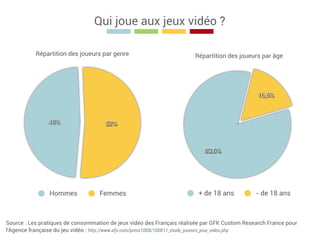 Le document présente des statistiques sur les joueurs de jeux vidéo en France, indiquant une répartition de 52% d'hommes et 48% de femmes, avec un âge moyen de 35,6 ans. Il inclut également des références à divers jeux vidéo et ressources éducatives, ainsi qu'une mention d'initiatives liées à la médiation par le jeu. Les données proviennent d'une étude réalisée par GfK Custom Research France pour l'Agence Française du Jeu Vidéo.