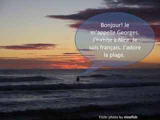 Le document présente des introductions simples en français, où plusieurs personnages se présentent, mentionnant leur nom, leur lieu de résidence, leur nationalité et leurs loisirs. Les personnages incluent Georges, Annette, Yannick et Mimi, chacun exprimant des intérêts variés tels que la plage, le vélo, le football et le rugby. Les photographs associées enrichissent les présentations avec des éléments visuels.
