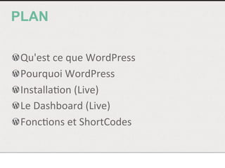Le document présente WordPress comme un système de gestion de contenu largement utilisé, permettant de créer et gérer divers types de sites web. Il met en avant ses avantages tels que sa gratuité, sa sécurité et une large communauté de support. Le document aborde également des fonctionnalités techniques comme les fonctions et shortcodes pour personnaliser le contenu.
