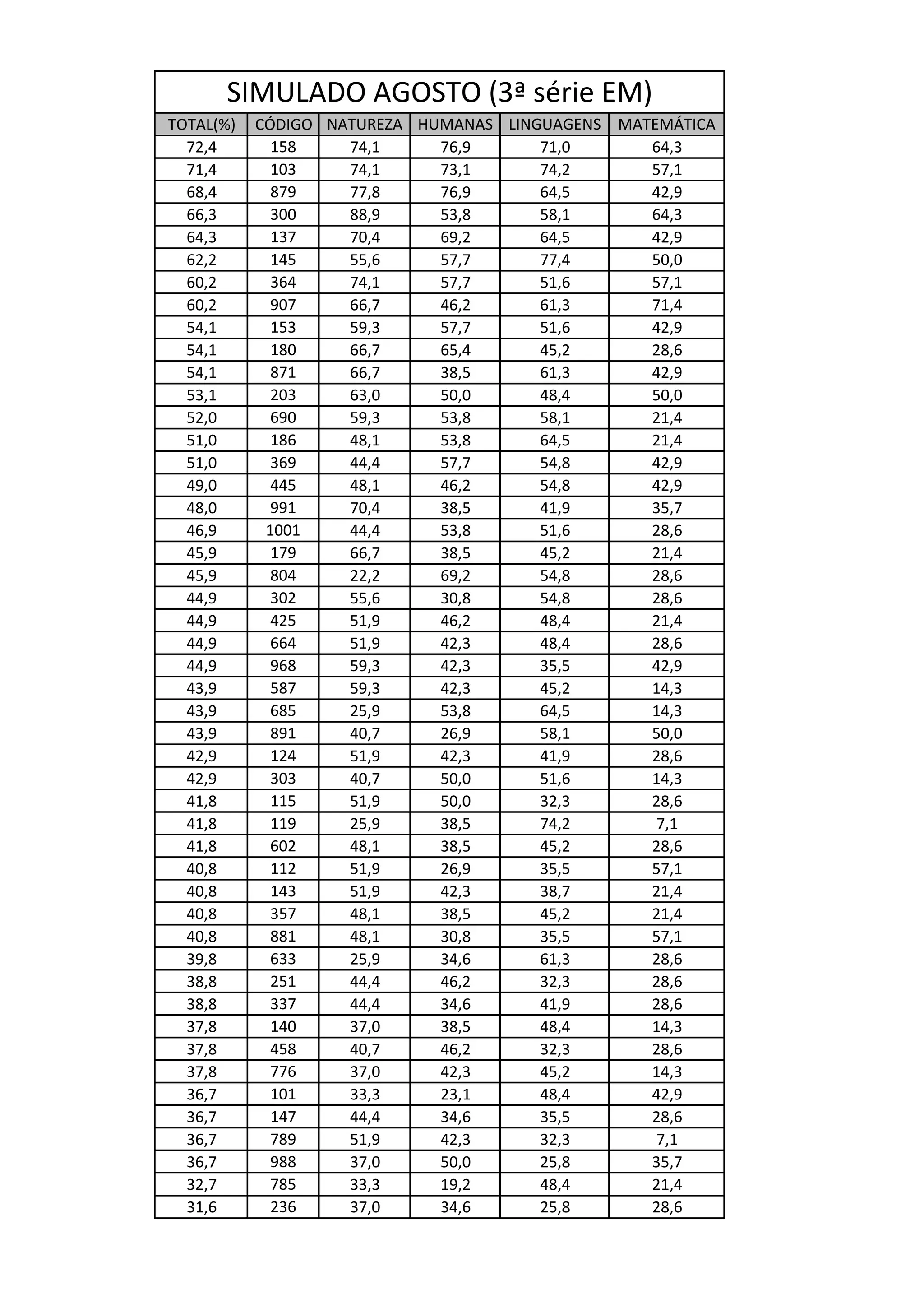 Le document présente les résultats d'évaluations d'élèves de 3ème série, avec des scores en pourcentage dans différentes matières, notamment les sciences humaines, les langues et les mathématiques. Les performances varient considérablement, certains élèves atteignant des scores aussi bas que 7,1 % tandis que d'autres atteignent jusqu'à 88,9 %. Les données peuvent être utilisées pour analyser les tendances et les domaines nécessitant une attention particulière en matière d'enseignement.