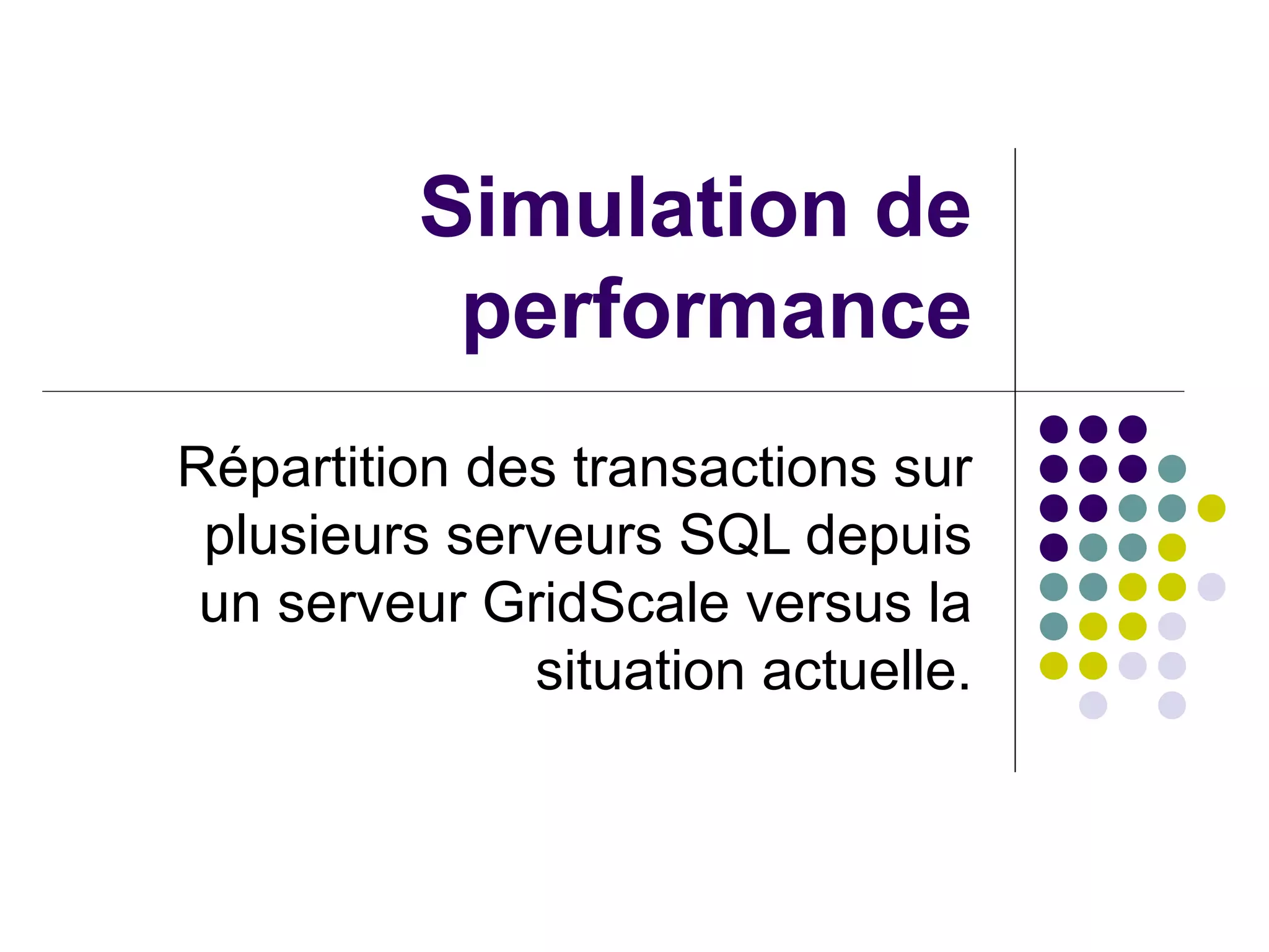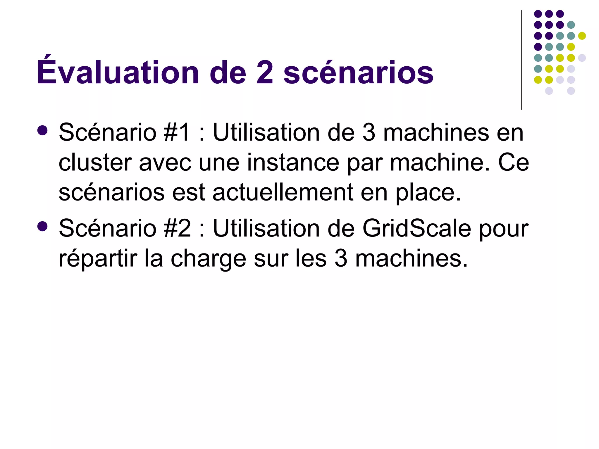 Ce document compare deux scénarios de répartition des transactions sur plusieurs serveurs SQL, en évaluant une configuration actuelle en cluster versus une approche utilisant GridScale. Le scénario avec GridScale permet une répartition de charge plus équilibrée, ce qui réduit la surcharge sur les serveurs lors d'événements de forte demande. Le scénario #2 offre une meilleure gestion des surcharges grâce à la possibilité d'ajouter rapidement des serveurs.